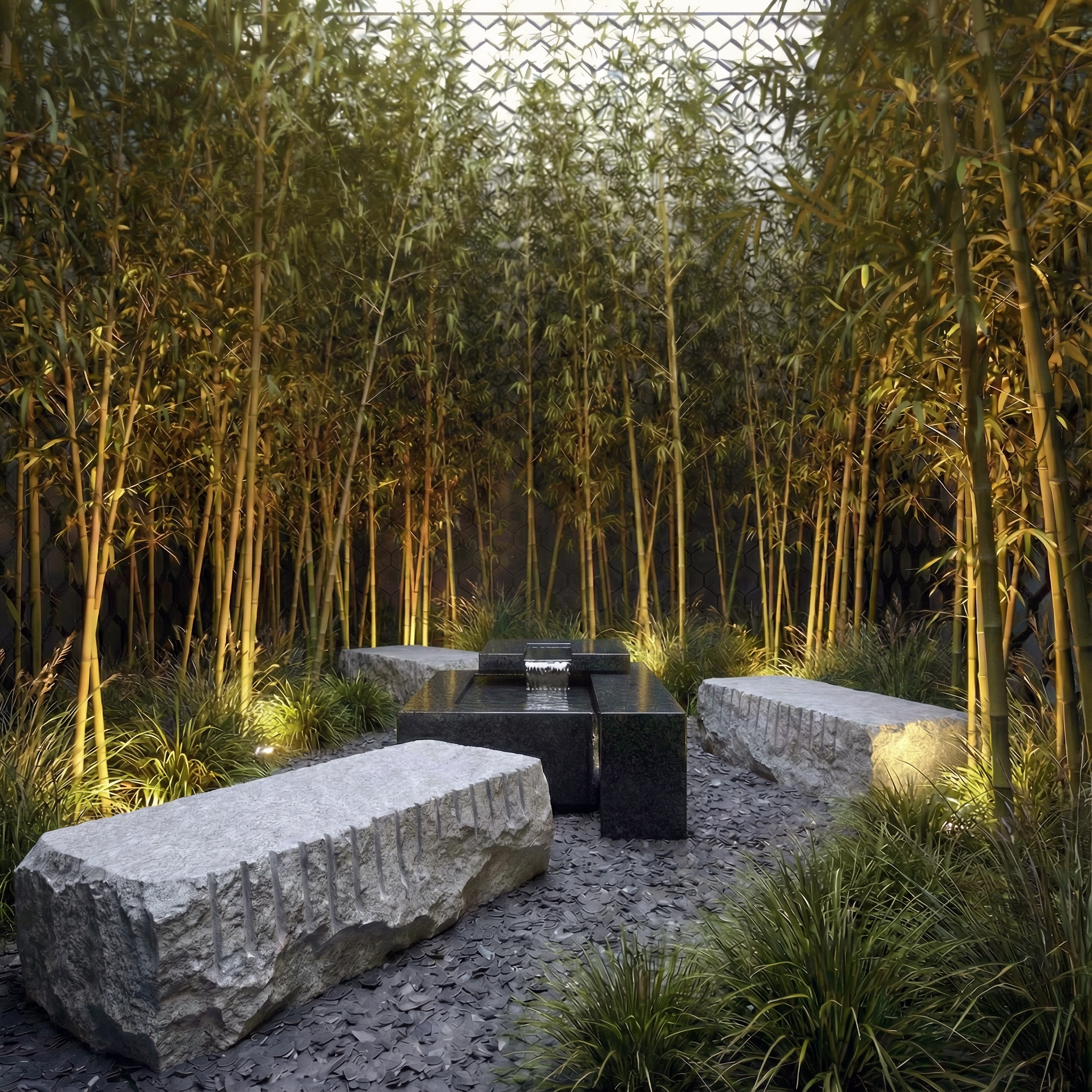 A design concept and 3d rendering for a courtyard in an art gallery.